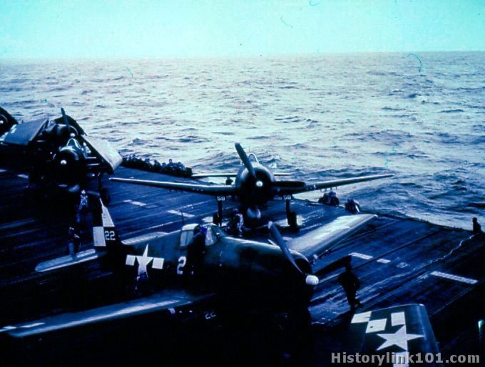 Planes on deck of USS Hornet. F6F's March 27, 1945