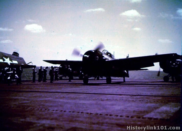 Launching a "Wildcat" FM-2 from deck of the USS Makin Island. May 12, 1945
