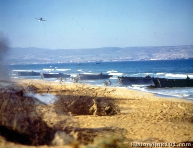 French Foreign Legionnaires in US uniform, practice with US equipment on North African beaches. Practice landings from LCV's. March 1944