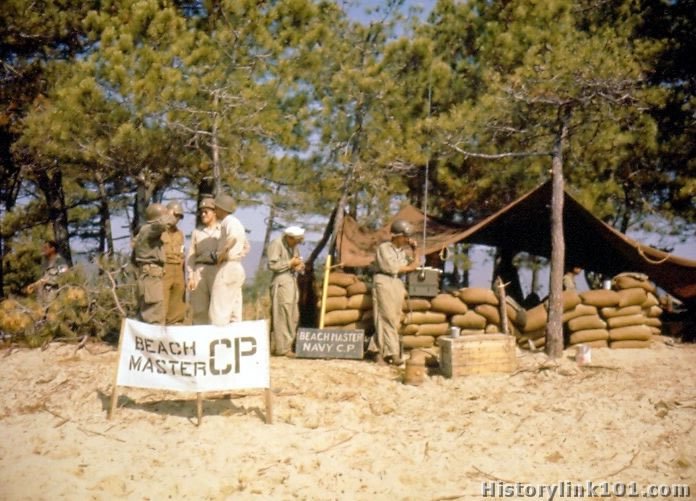 Navy French Battalion headquarters on the shore of Southern France, used to direct in-coming vessels. August 18, 1944. Beach masters confer while a communications man passes the work along over a radio-telephone to incoming vessels.