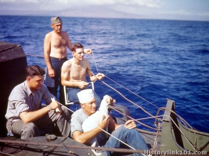 Favorite passtimes at sea. Officers and men fishing on fantail of landing craft. Hawaiian Is. January 18, 1945