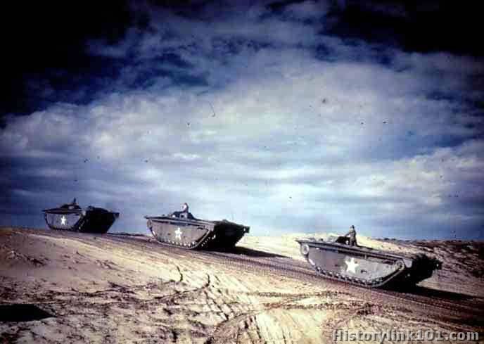 Amphibious LVT's are shown on maneuvers. Rolling over sand dune. June 1944