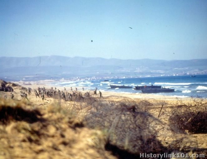French Foreign Legionnaires in US uniform, practice with US equipment on North African beaches. Practice landings from LCV's. March 1944