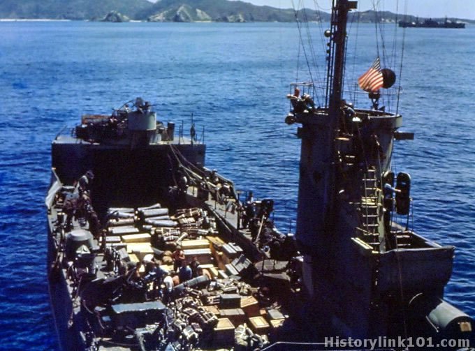 An LSM with supplies near Okinawa as a giant Task Force gets underway. May 1945