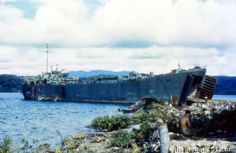 LST beaches on Segi Point in Solomons to discharge cargo. Dec. 1943