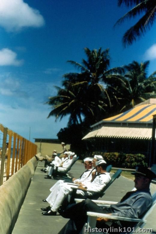 Various scenes at Hawaii. Sailors relax on patio of Royal Hawaiian Hotel.