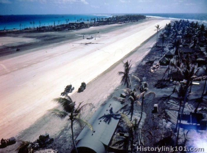 Construction work on the landing strip at Eniwetok I., Marshalls. Four motored planes on the landing strip. 1944
