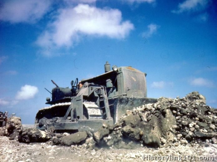 Construction work on the landing strip at Eniwetok I., Marshalls. Four motored planes on the landing strip. 1944