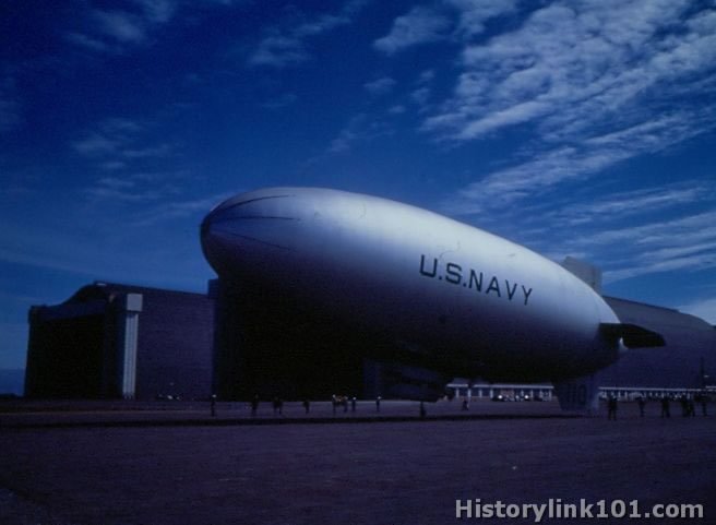 Navy blimps and ground crews at NAS Moffett Field.