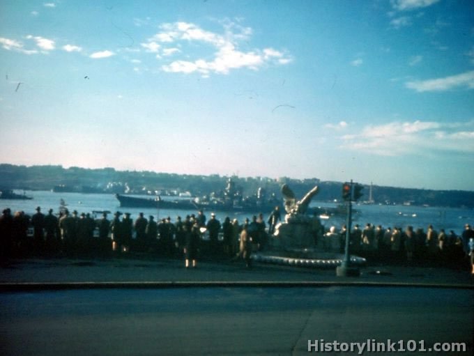 Various scenes at New York, NY, on Navy Day. USS Missouri is seen from Harbor Point.