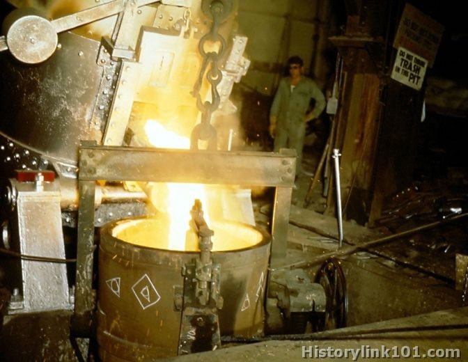 Activity is shown at Navy Yard, Pearl Harbor, TH. Flaming steel pours into cauldron in foundry.