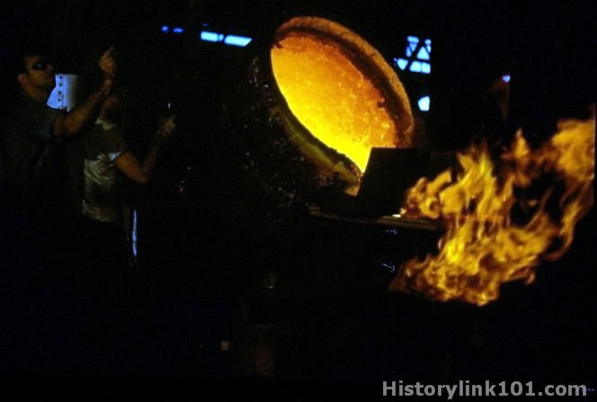Activity is shown at Navy Yard, Pearl Harbor, TH. Flaming steel pours into cauldron in foundry.