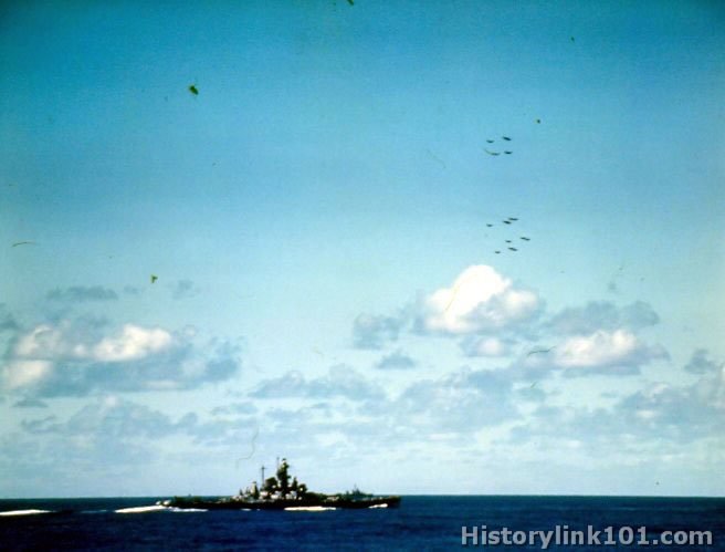 US Battleship is seen from USS Yorktown. Formation of planes is flying overhead.