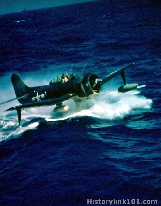 Landing in fairly heavy sea alongside his ship USS Alaska in "Seahawk" SC-1. March 6, 1945