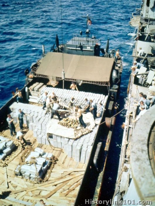 Loading ammunition from letter to USS Alaska as seen from USS West Virginia. April 1, 1945