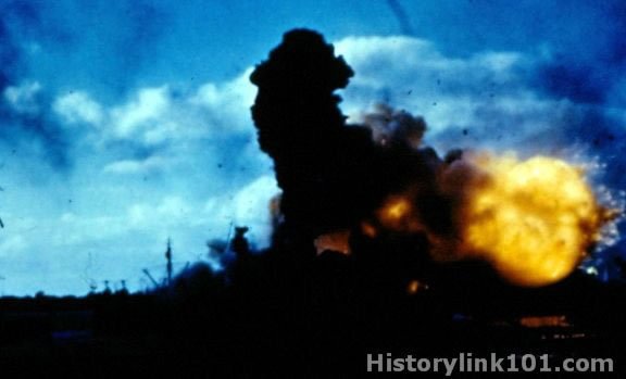 USS Arizona burn fiercely at Pearl Harbor after Jap attack.