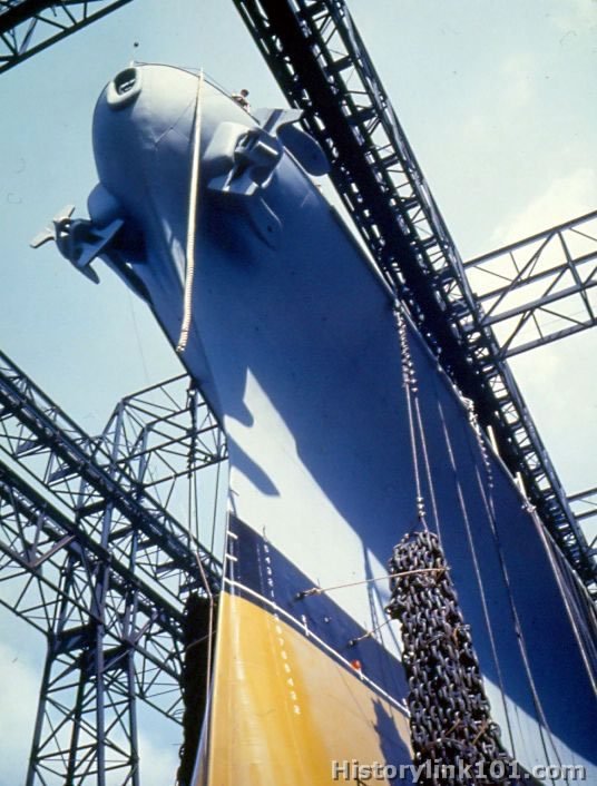 USS Iowa is shown in New York Navy Yard before launching. April 1942