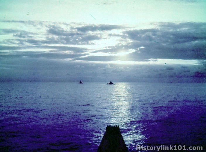 Saipan operation as seen aboard the USS Iowa. June 19, 1944. Sunset finds peace and quiet for the time being. Battleships maintain their vigil as night sets in over the Mariannas.