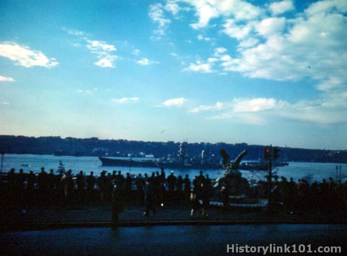USS Missouri and other ships anchored in the Hudson for fleet review on Navy Day in New York City. Oct. 26, 1945