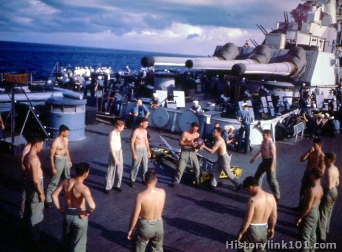 Marines on the USS Missouri keep physically fit by passing around a medicine ball during leisure moments.