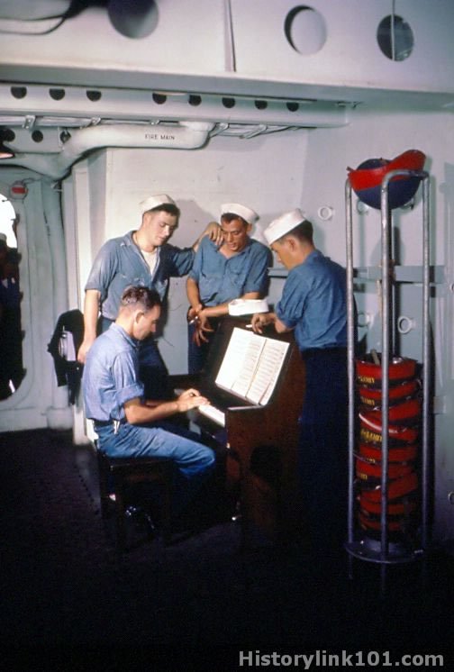 Piano set up in a passageway gets frequent use during off-duty hours on the USS Missouri.
