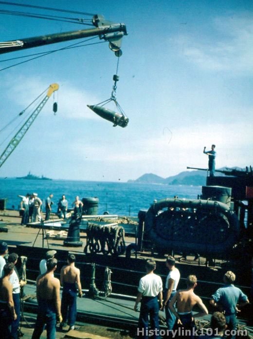 Loading 16 inch projectiles on USS West Virginia at Karama Retto on Love Day minus 2. March 29, 1945