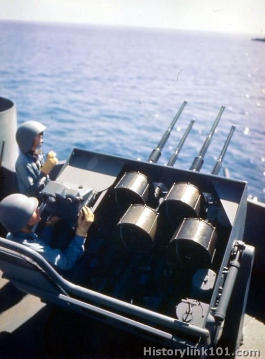 Quadruple 20mm mounts on the USS West Virginia taken during Okinawa invasion. April 16, 1945