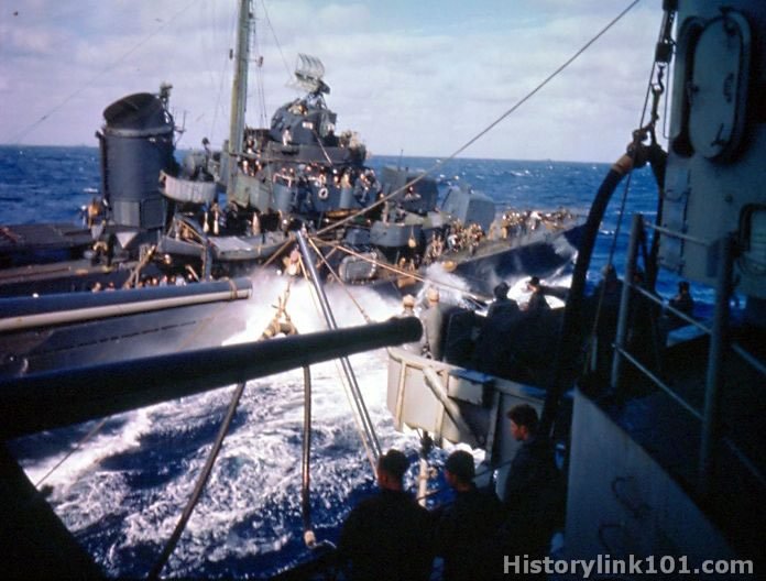 Destroyer coming alongside USS Wisconsin for refueling. Feb. 27, 1945