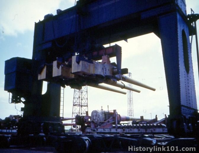 Various phases of gun testing are shown at Navy ordnance proving ground, Dahlgren, VA. 16" guns in triple mount await shipment.