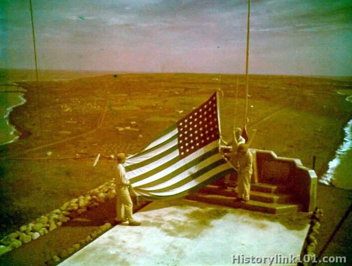 Maury Maverick's flag is raised over Iow Jima, Oct. 12, 1945