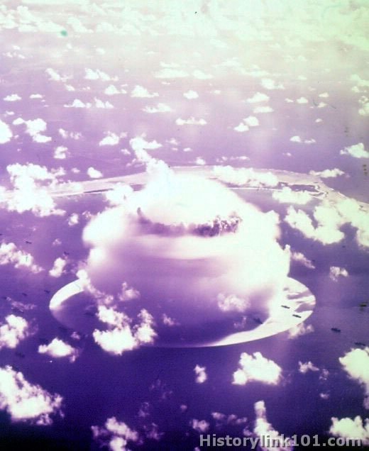 "A" day first atomic bomb burst at Bikina Atoll in the Marshall Islands during the joint Army Navy Atomic bomb test. July 1, 1945
