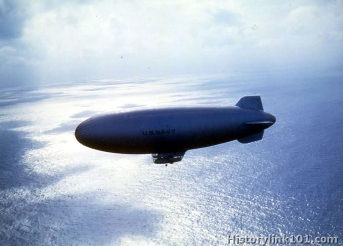 Navy blimps are shown on patrol over Atlantic Ocean, looking for emeny submarines in shipping lanes. 1942