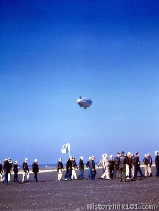 Lighter than air activities as NAS, Lakehurst, NJ. Blimp recedes into distance as line handling crew leaves field.