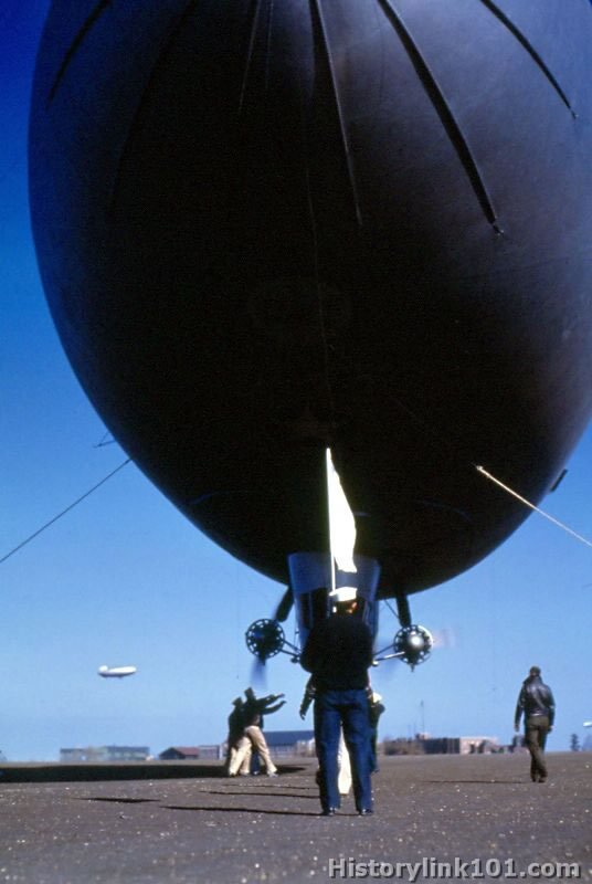 US Navy blimp activity is pictured over land and sea.