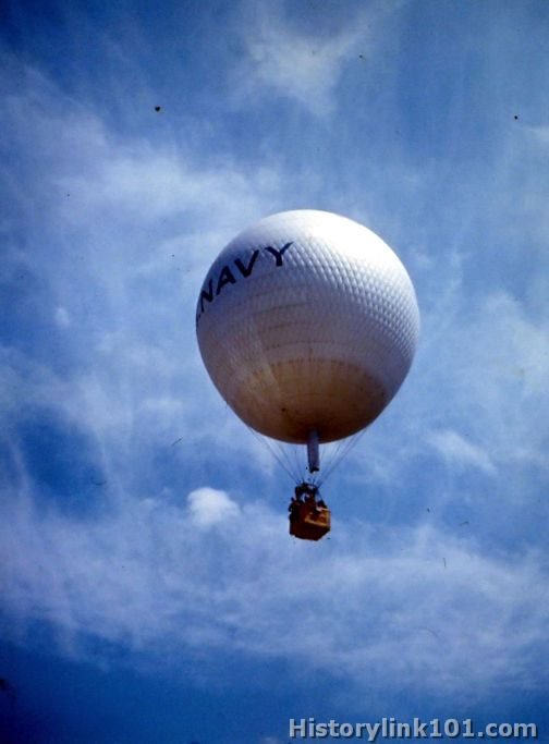 Navy balloons are pictured in flight and on ground soaring upward.