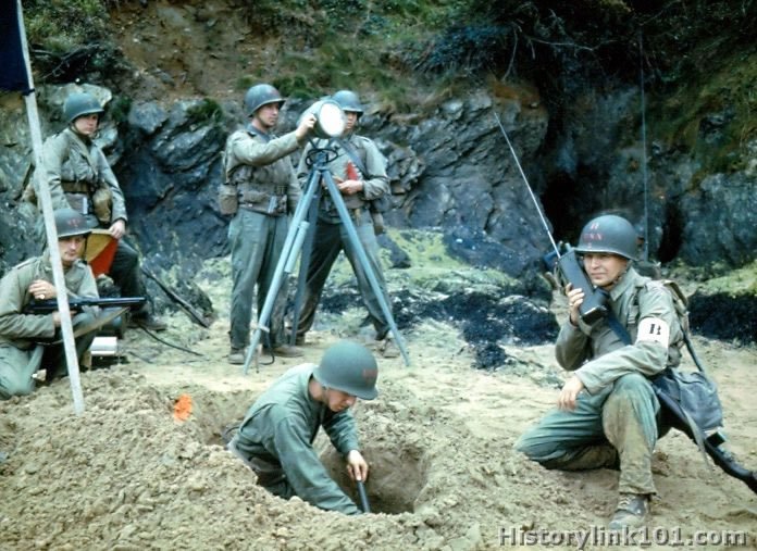 Men of US N. Beach Battalion rehearse in England for actual battle of D-Day. USN Beachmaster uses walkie talkies as others handle other communications equipment.