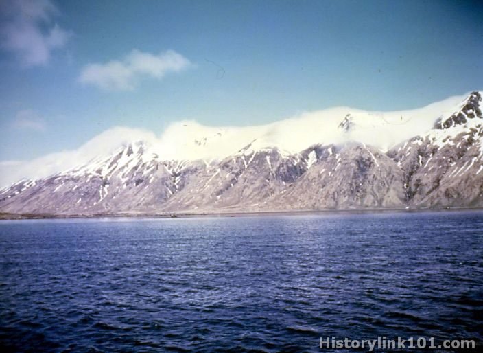 Massacre Bay, Attu, is shown after invasion by US Troops. Looking toward Blue Beach.