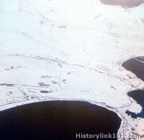 Oblique of Navy runways at Massacre Bay, Attu, Aleutian Islands. November 16, 1943. Showing hangars revetments, taxiways and incompleted north and south runway.