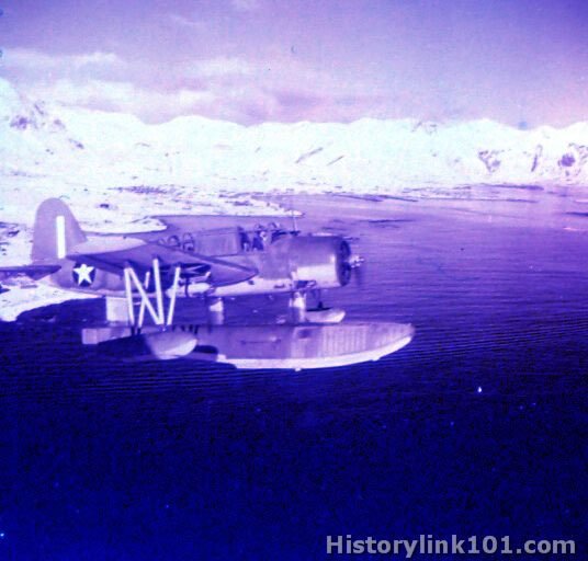 OS2U of VS56 in flight over Massacre Bay area. Aleurian Islands - November 16, 1943