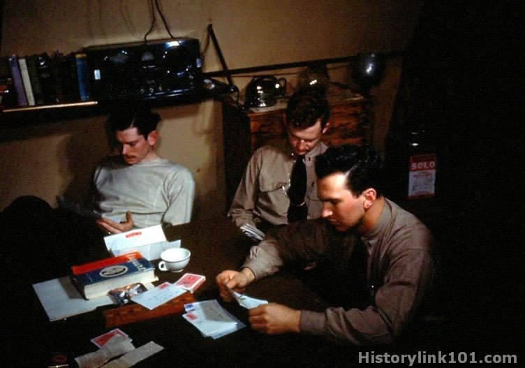 Various activities of pilots are shown at advanced base in Aleutians. Reading mail from home in quarters.