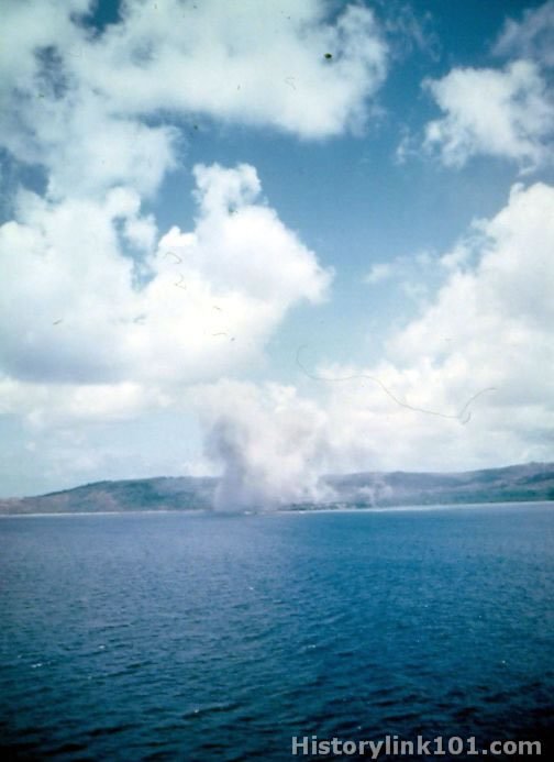 Smoke pours up from Agona, Guam as US dive bombers and cruisers pound it with bombs and shells.
