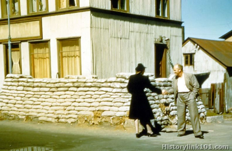 View of Reykjavik, Iceland. Sand bags pillbox in the streets built by the British.