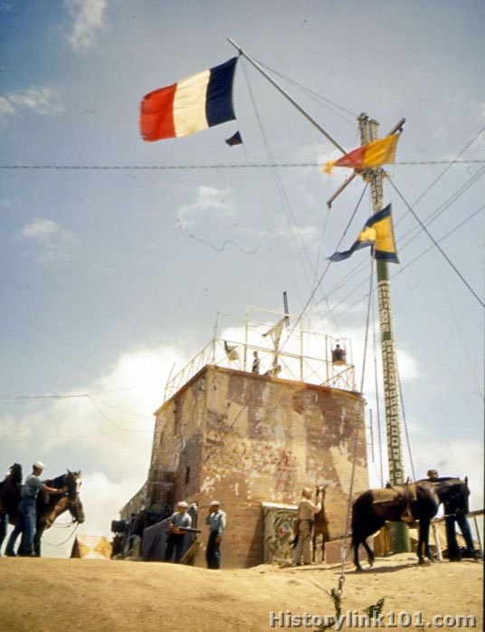 USN signal tower is shown at New Caledonia outpost. Supplies are hauled in by pack horses. Tricolors and fighting French ensign fly from mast.