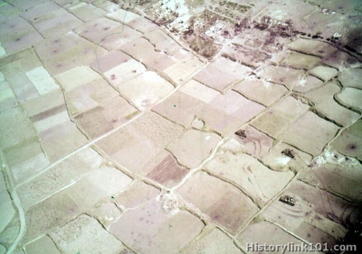 Love day landings on Okinawa showing Yantam airstrip with Army tanks in possession of field. Taken from USS Makin Island. April 1, 1945
