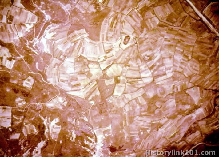 Aerial of Okinawa as seen from plane from USS Hornet. April 1945