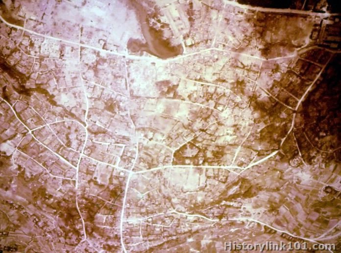 Aerial of airfield at Okinawa, Ryukyus. As seen from plane USS Hornet. April 18, 1945