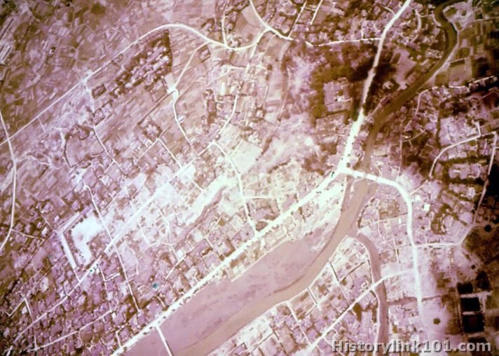 Aerial of Okinawa as seen from plane from USS Hornet. April 1945