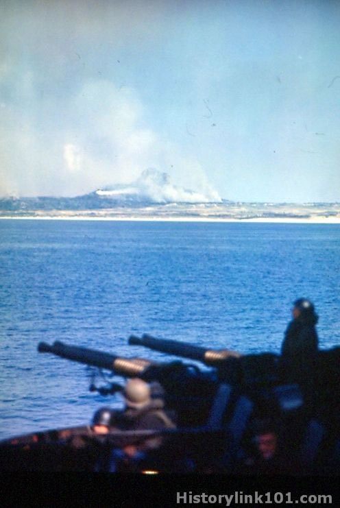 Invasion of Ie Shima just off Okinawa in the Ryukyus, taken by the USS West Virginia. Gosuki Mountain in background. April 16, 1945