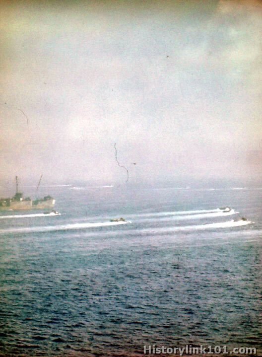 Landing craft going into beach of Okinawa Jima on Love day as seen from USS West Virginia. April 1, 1945