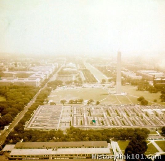 Buildings in Washington, DC. Taken from US Navy blimp from NPC Anacostia. Washington Monument. August 5. 1946